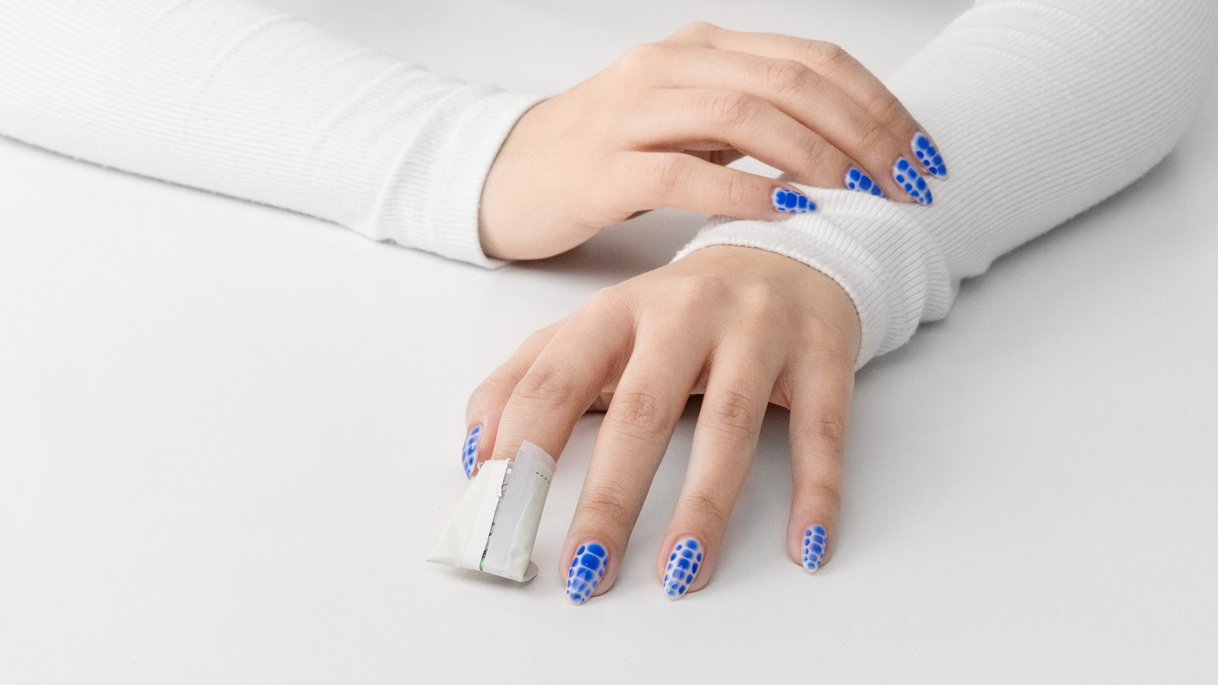 Tear across the dotted line and place the nail inside the pouch, pressing the nail surface against the moist pad.